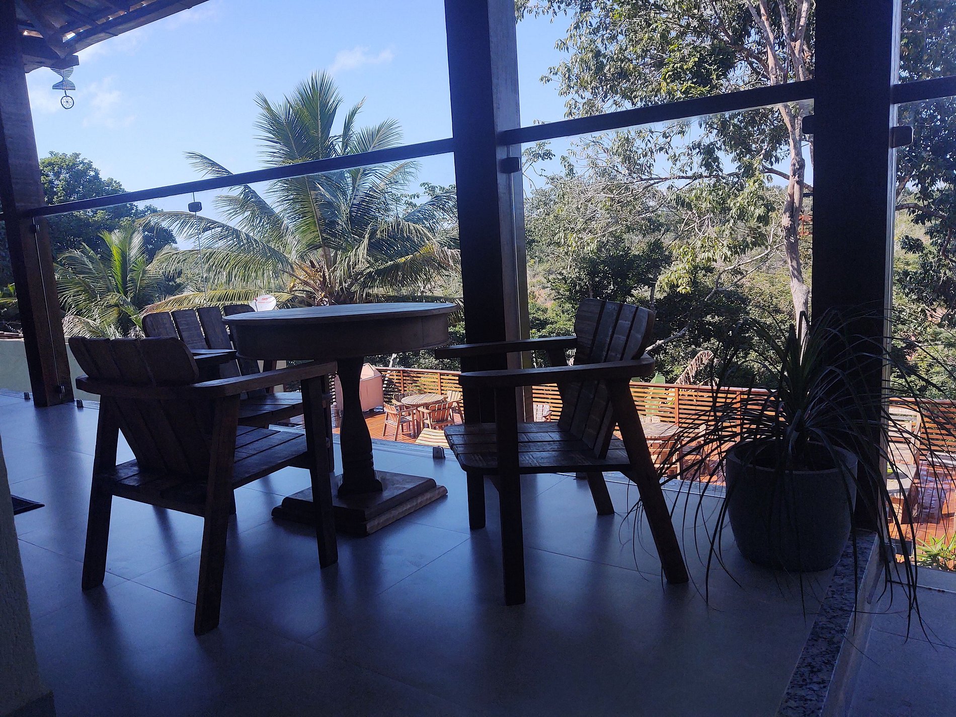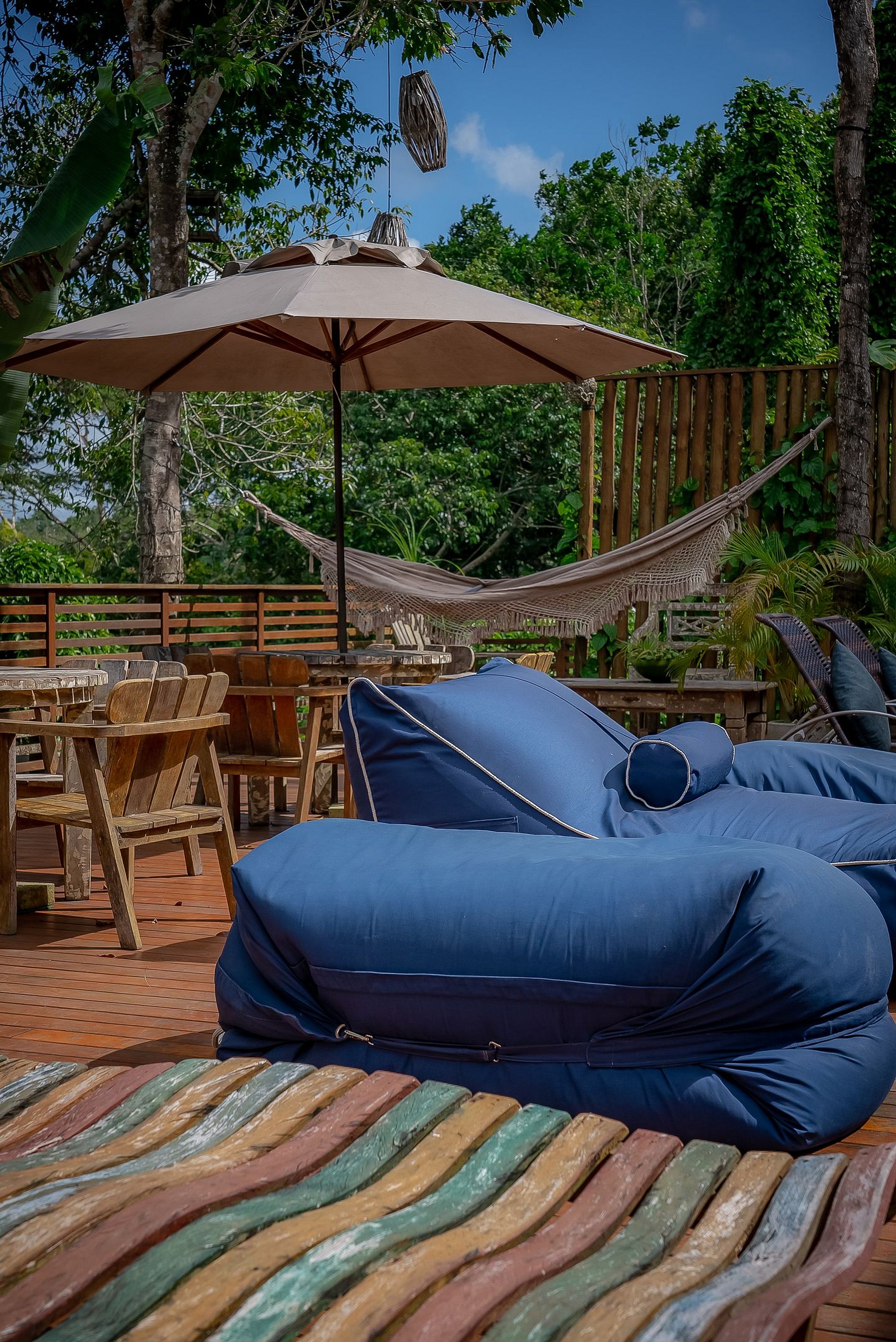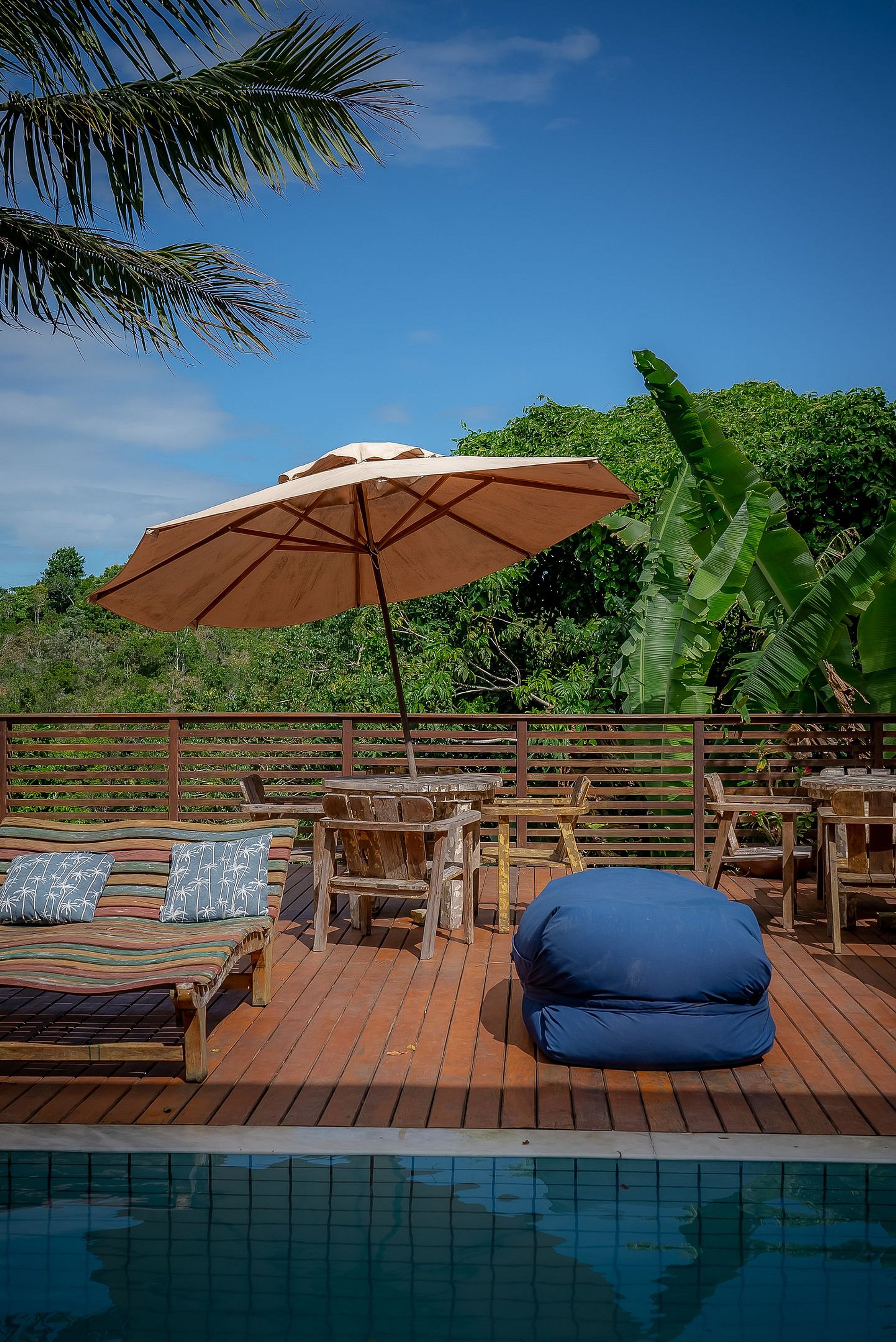 O amplo deck de madeira garapa com mais de 120 m2, conta com espreguiçadeiras e uma linda piscina. Fica literalmente debruçado para as copas de árvores do vale dos gringos/mucugê com inúmeros e variados pássaros e animais silvestres como micos.