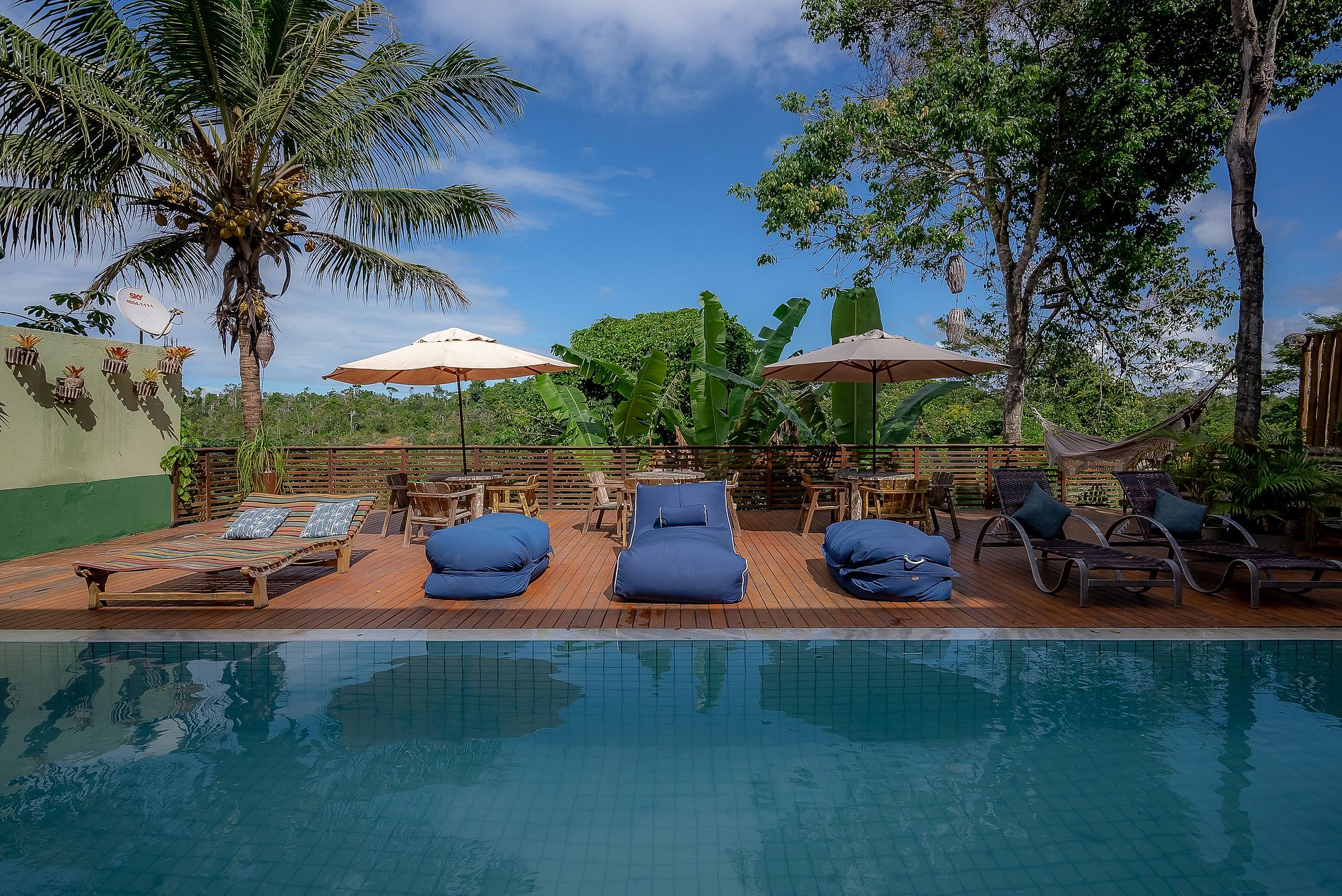 O amplo deck de madeira garapa com mais de 120 m2, conta com espreguiçadeiras e uma linda piscina. Fica literalmente debruçado para as copas de árvores do vale dos gringos/mucugê com inúmeros e variados pássaros e animais silvestres como micos.