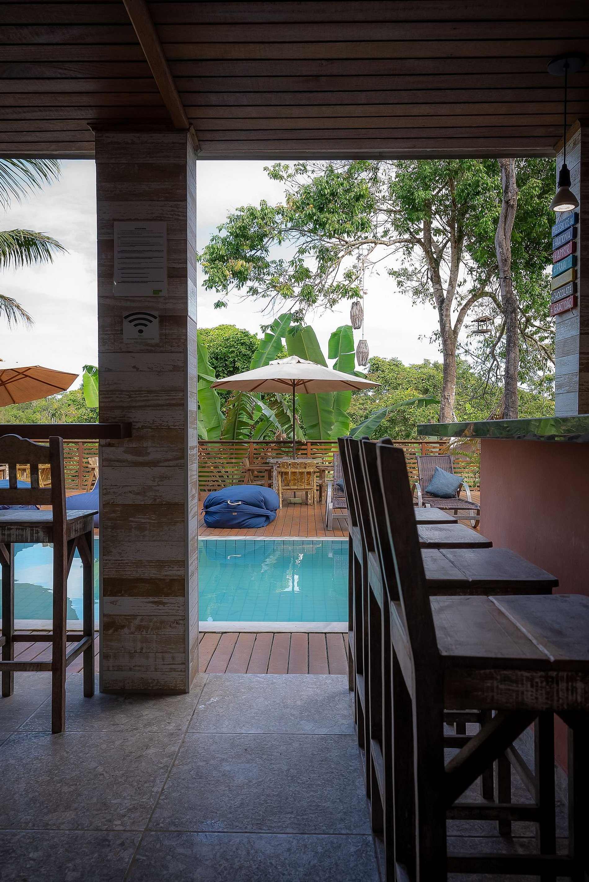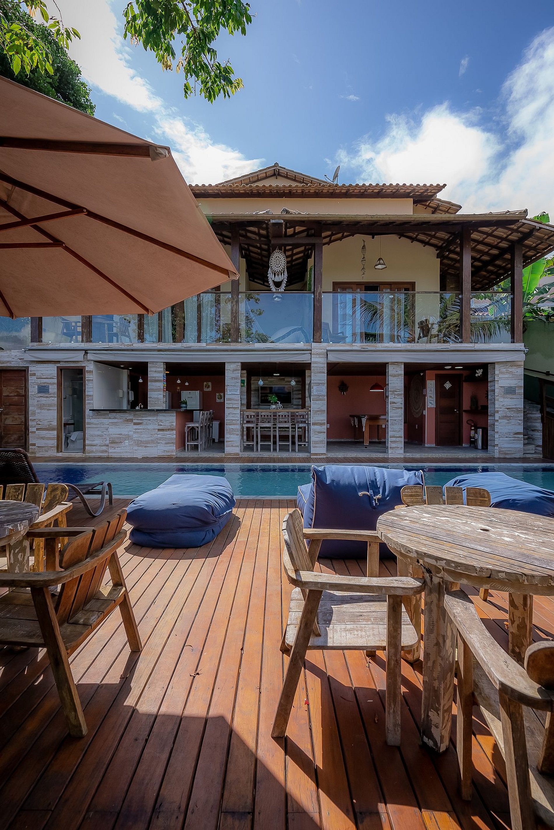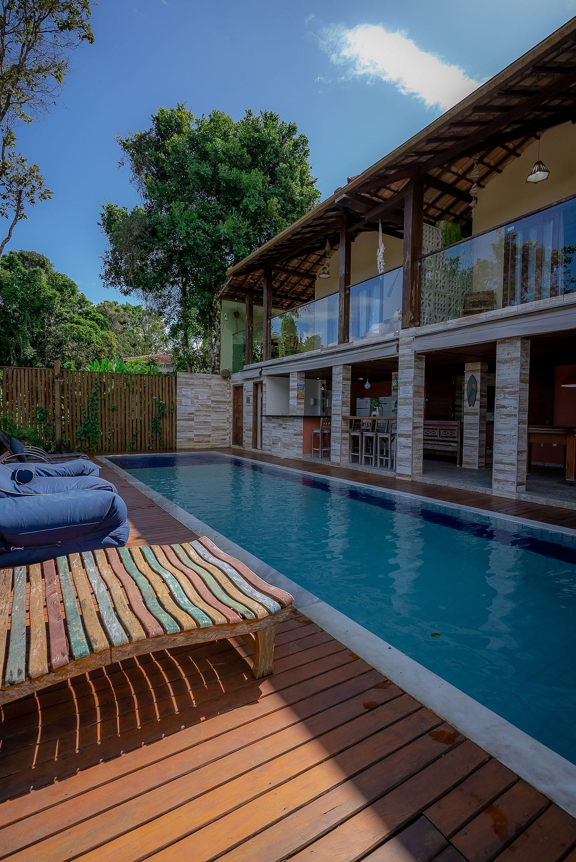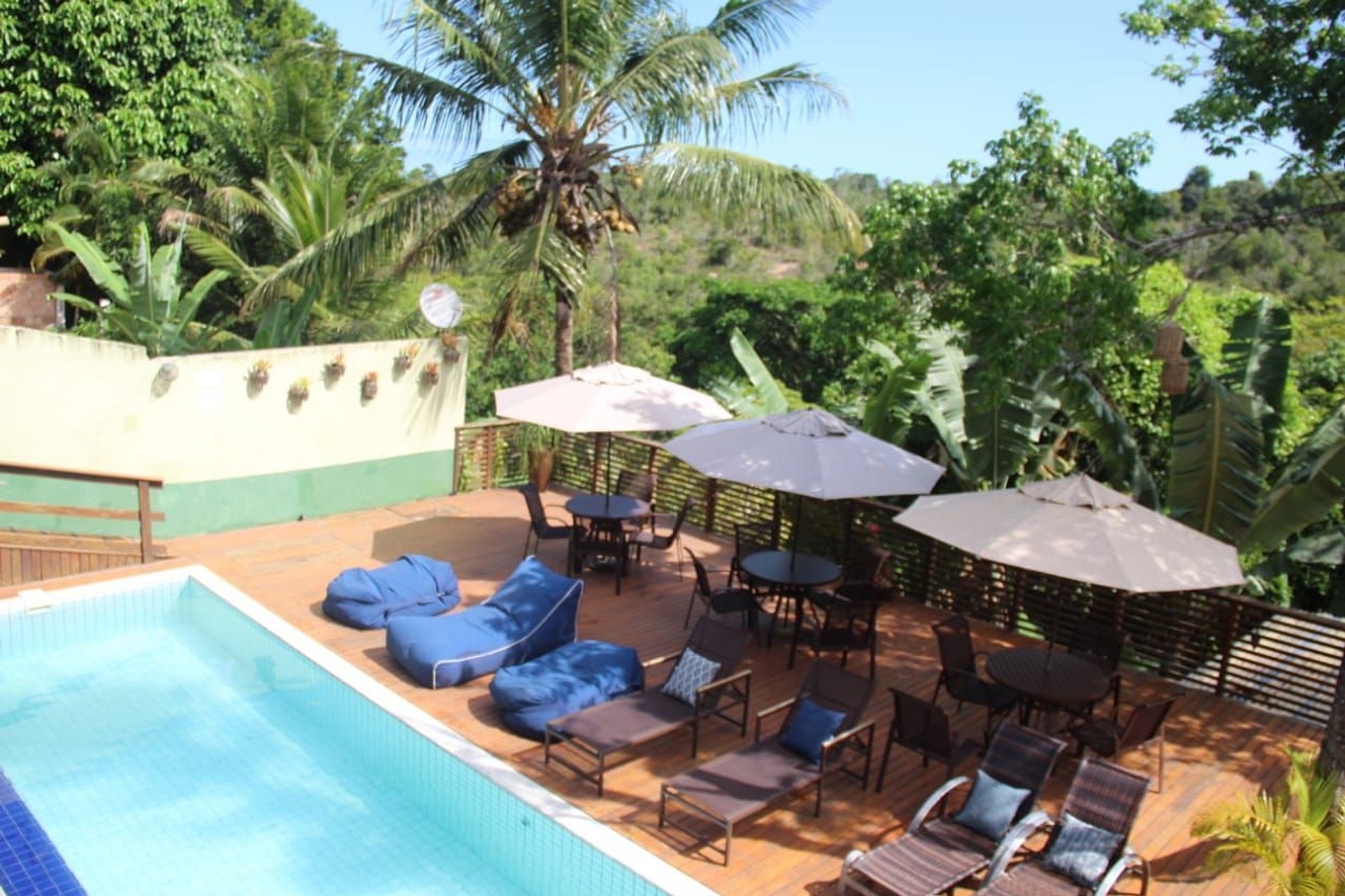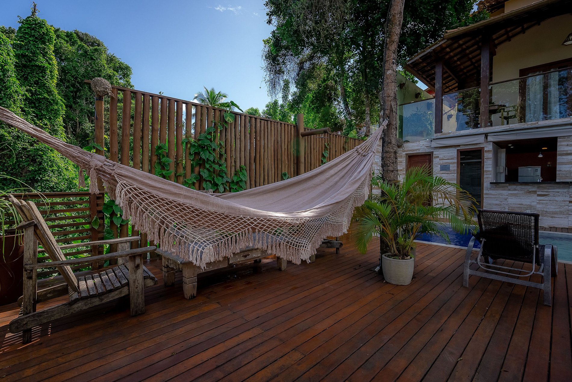 O amplo deck de madeira garapa com mais de 120 m2, conta com espreguiçadeiras e uma linda piscina. Fica literalmente debruçado para as copas de árvores do vale dos gringos/mucugê com inúmeros e variados pássaros e animais silvestres como micos.